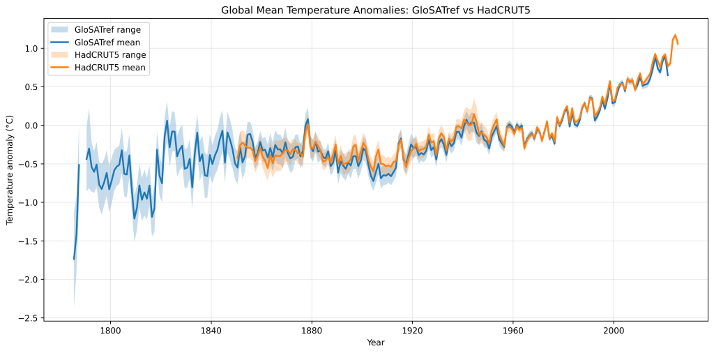 The extension of GloSATref before 1850 is much more variable than in the later period. This is due to a combination of sparse sampling and because it captures some cooling events caused by several large volcanic eruptions.