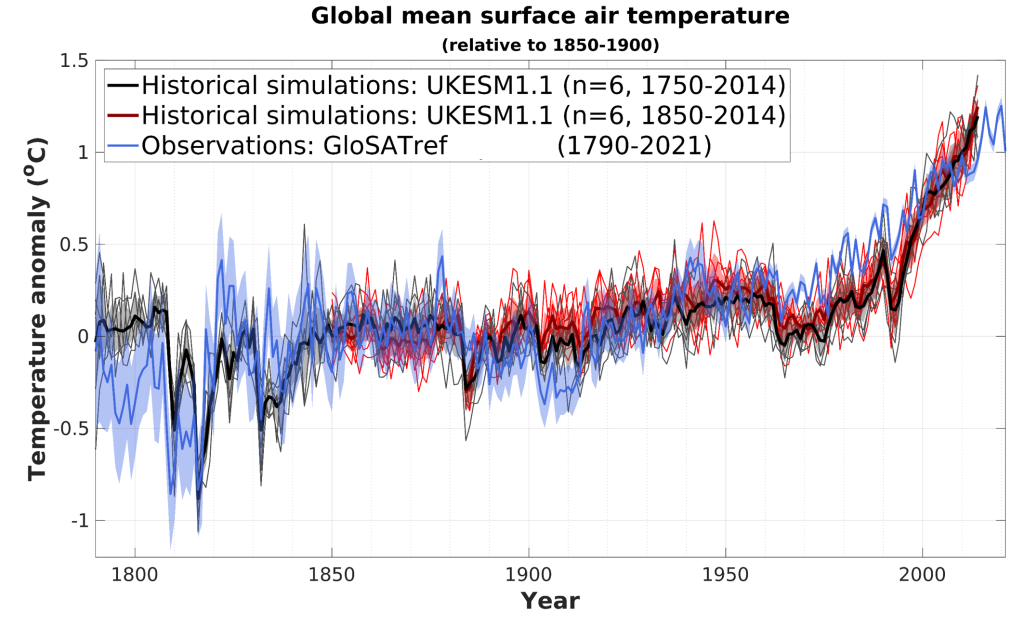GloSAT also funded an ensemble of runs of the joint Natural Environment Research Council (NERC) and Met Office climate model global climate model UKESM1, but starting in 1750 rather than 1850, the usual start data for CMIP historical simulation experiments used extensively in IPCC reports. This was to enable a comparison with the early part of the GloSATref dataset using an "IPCC-class" model.